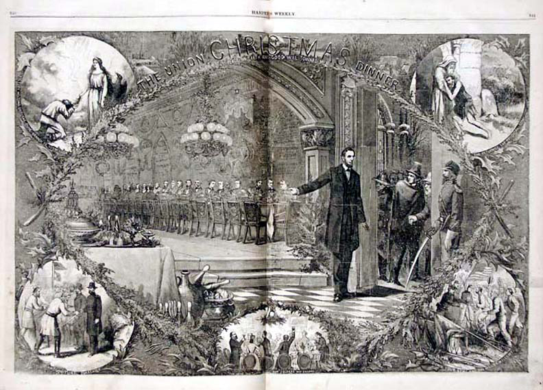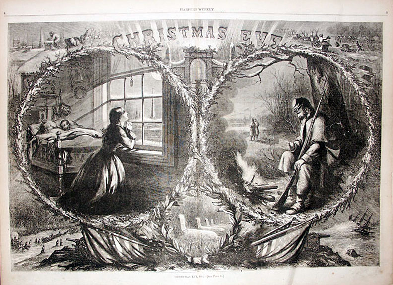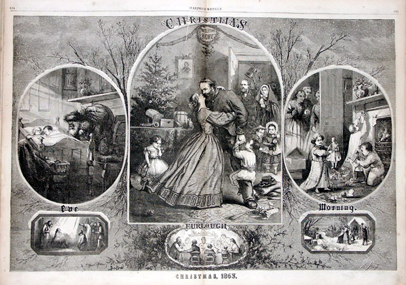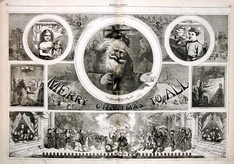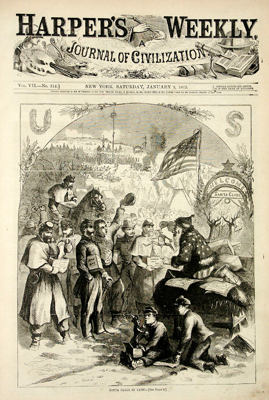 to show the news to the readers. This full page cartoon ran on the front page, January 3, 1862. It depicts Santa visiting the soldiers during the holiday cease fire. Nast's Christmas cartoon was so popular, it became an annual event at Harper's