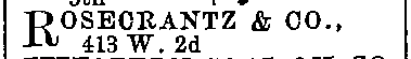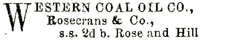 Rosecrans Residence Rosecrans, Wm., factor, 423 W. 7th George Street goes between Bay Miller and Mound Barr north of George and Seventh above Barr Rosecrantz & CO., 413 W. 2d Street ![]() Western Coal Oil CO., ![]() Rosecrans & Co., s.s.2d b. Rose and Hill (south side 2nd between Rose and Hill Streets) |