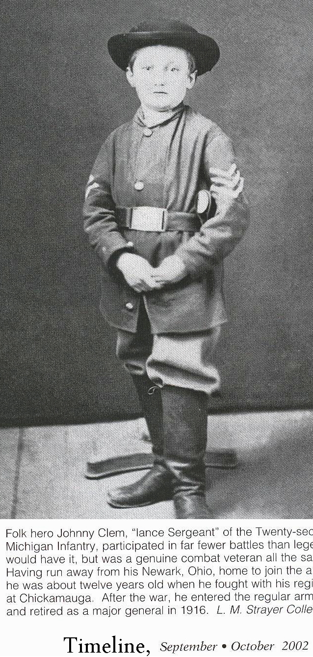 2 p.m. | Johnny Lincoln Clem was born in Licking County, Ohio and ran away from home to join the army at the age of 10. He was rejected due to age and size but followed the soldiers until they adopted him as the drummer boy and mascot. Payton Seats presents the story of the Civil War's youngest officer. |