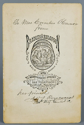 wholesale dealer of daguerreian stock on the west coast. Photographer Bradley won second best daguerreotype at the 1856 California State Fair from his studio on Clay Street. William Herman Rolofson and Bradley became partners and bought out Robert Vance's photography studio at 429 Montgomery Street in San Francisco in 1863. In 1874 they won an award for the 3 Best Cabinet negatives. |