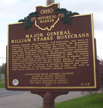 Soldier, engineer, and statesman, W. S. Rosecrans was born in Delaware County in 1819 and grew up in Homer. He graduated from West Point in 1842. During the Civil War, Rosecrans commanded the federal Army of the Cumberland. Popular with his troops, who called him “Old Rosy”, he was a cautious commander and, though victorious at Corinth, Murfreesboro, and Chattanooga, he suffered major defeat at Chickamauga in 1863. A skilled engineer, Rosecrans developed coal properties in western (now West) Virginia before the war and helped design St. Joseph’s Cathedral in Columbus for his brother, Bishop Sylvester Rosecrans. Following the war he served as minister to Mexico and represented California in Congress from 1881 to 1885. He died in 1898 and is interred at Arlington National Cemetery. | ||||