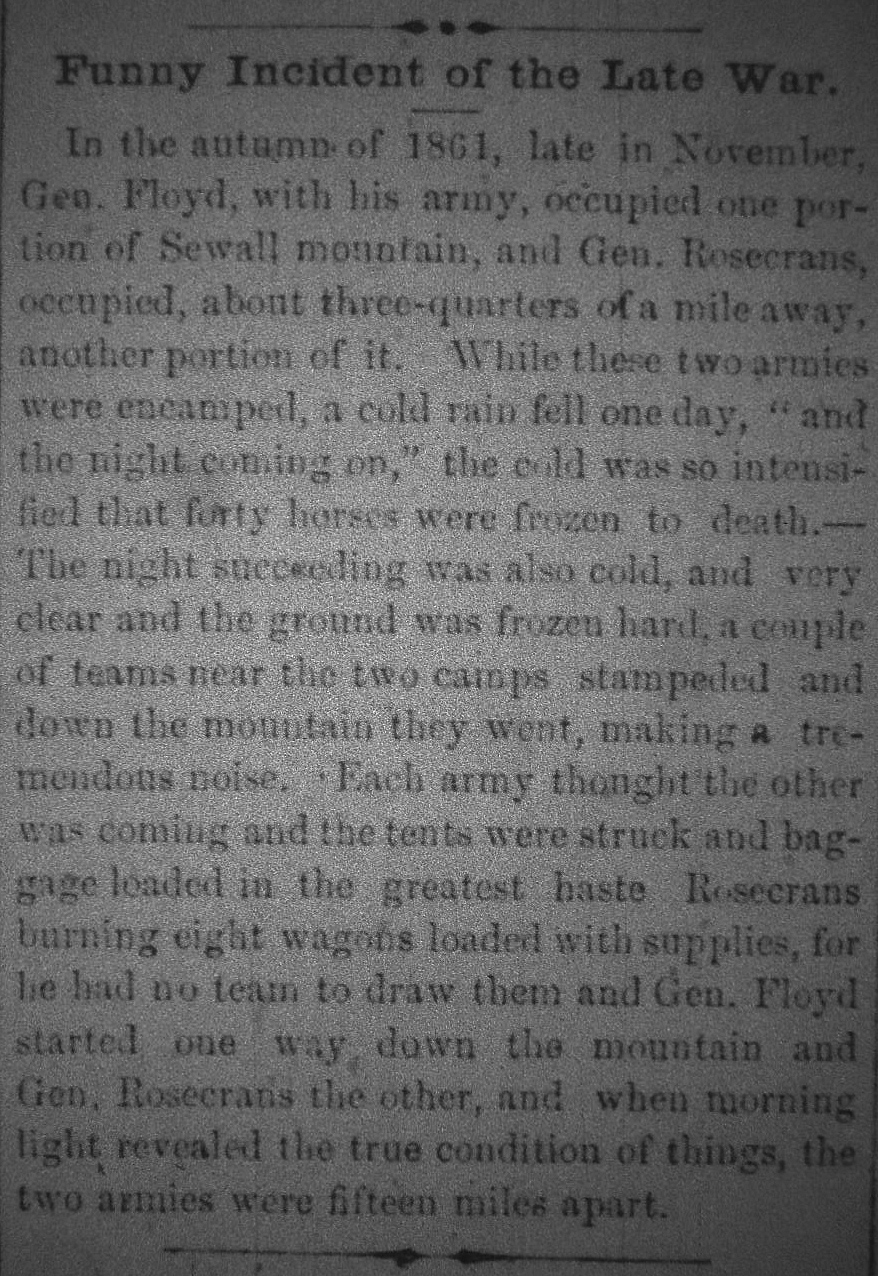 cold was so intensified that forty horses were frozen to death.--- The night succeeding was also cold, and very clear and the ground was frozen hard, a couple of teams near the two camps stampeded and down the mountain they went, making a tremendous noise. Each army thought the other was coming and the tents were struck and baggage loaded in the greatest haste, Rosecrans burning eight wagons loaded with supplies, for he had no team to draw them and Gen. Floyd started one way down the mountain and Gen. Rosecrans the other, and when morning light revealed the true condition of things, the two armies were fifteen miles apart. |
