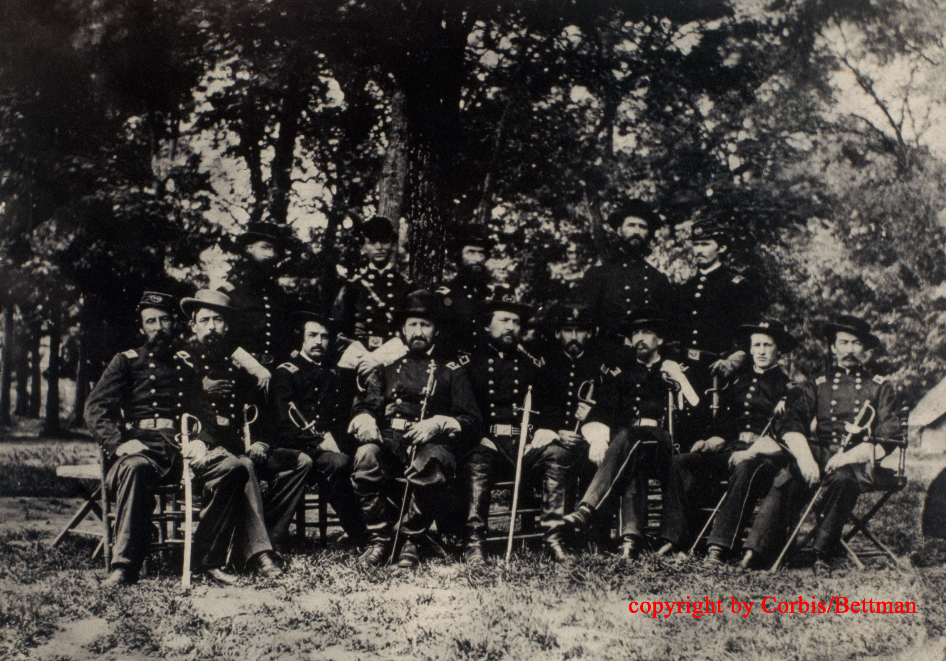 Thompson, and Major General Philip Henry Sheridan. Standing left to right: Brigadier General George Henry Thomas, Captain William M. Wiles, Major Jacob E. Taylor, Lt. Col. Samuel Simmons, Capt. James Q. Droillard |