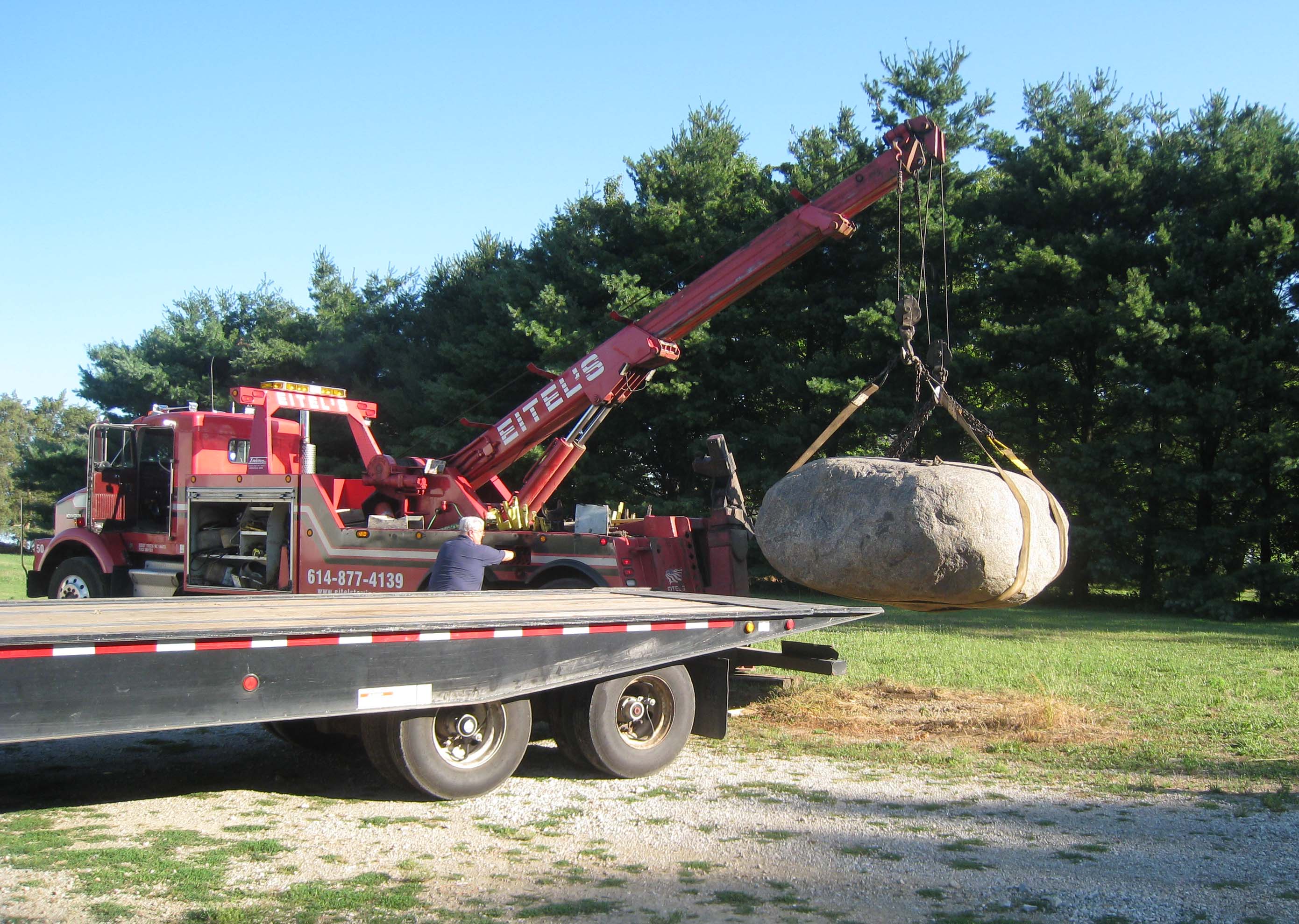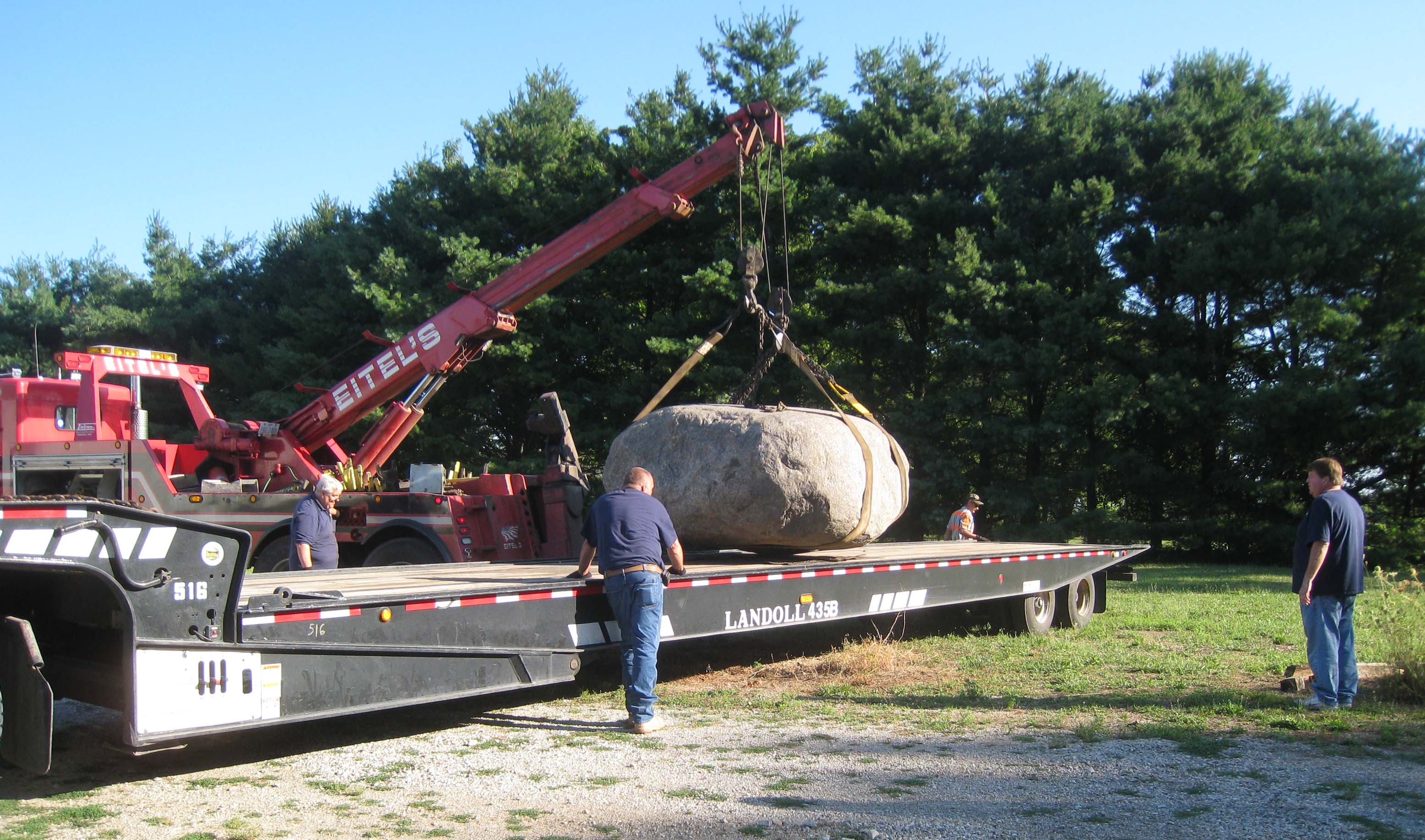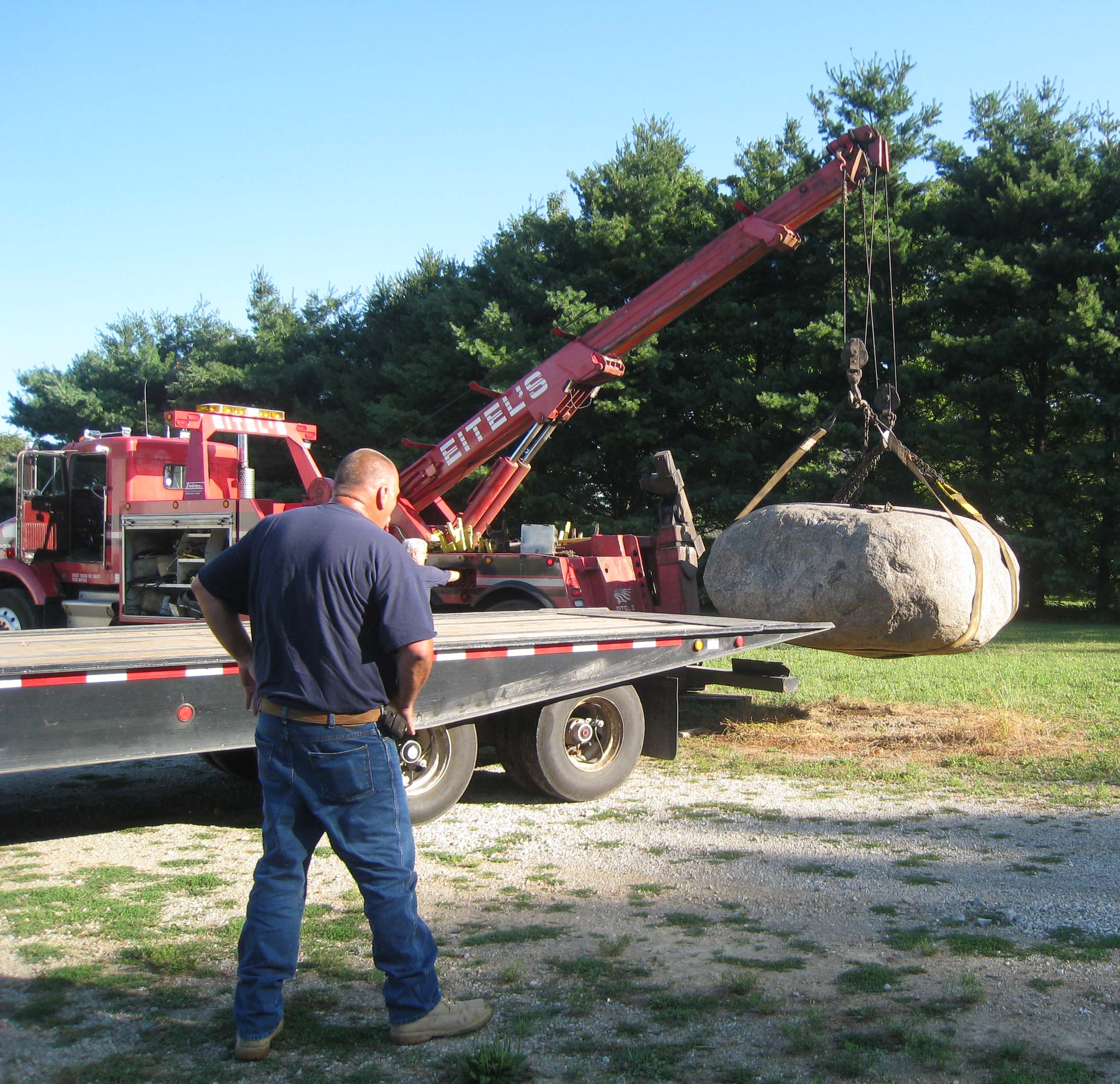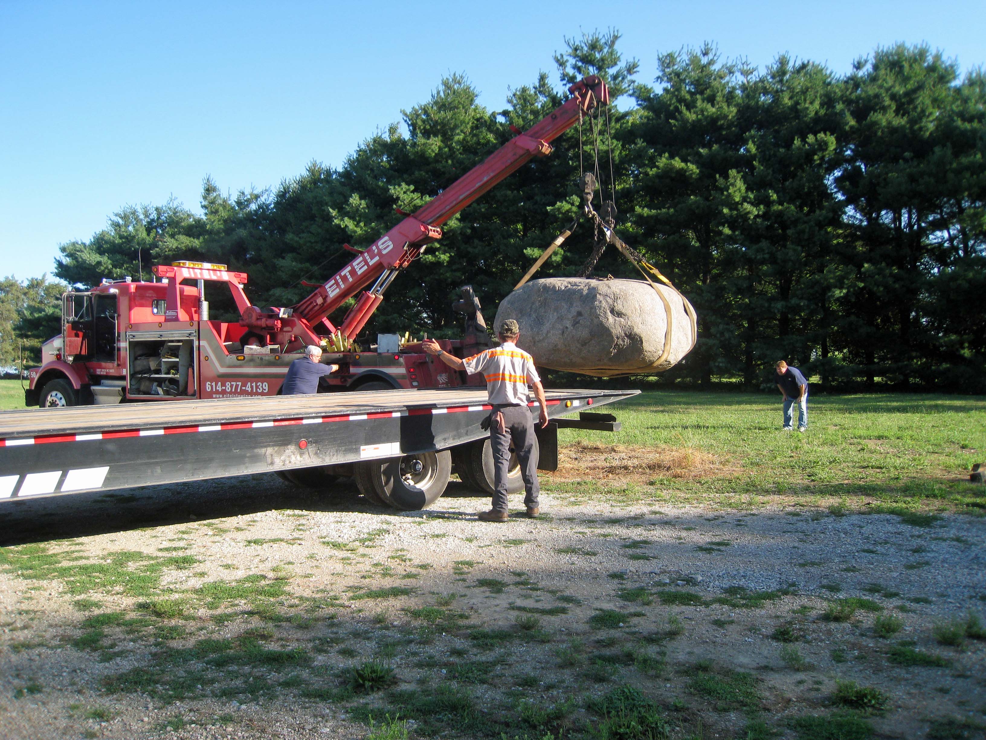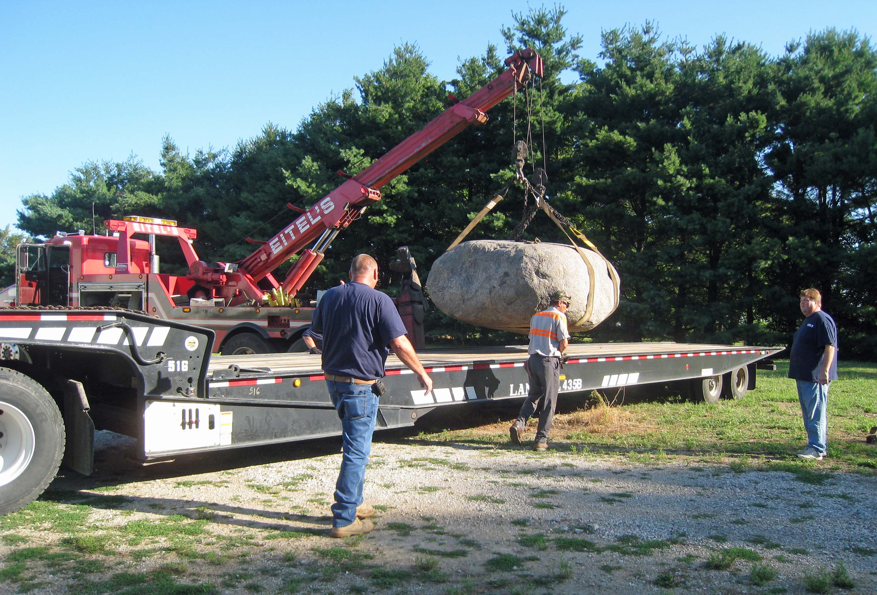 8:05 a.m. Stacy Wills and crew of Eitels Towing arrived at Tom Paul's farm to pick up the boulder stored there almost 2 years ago. |