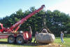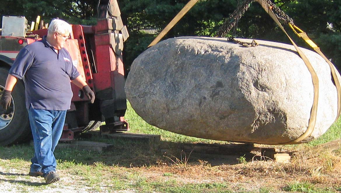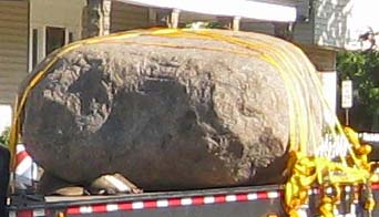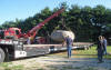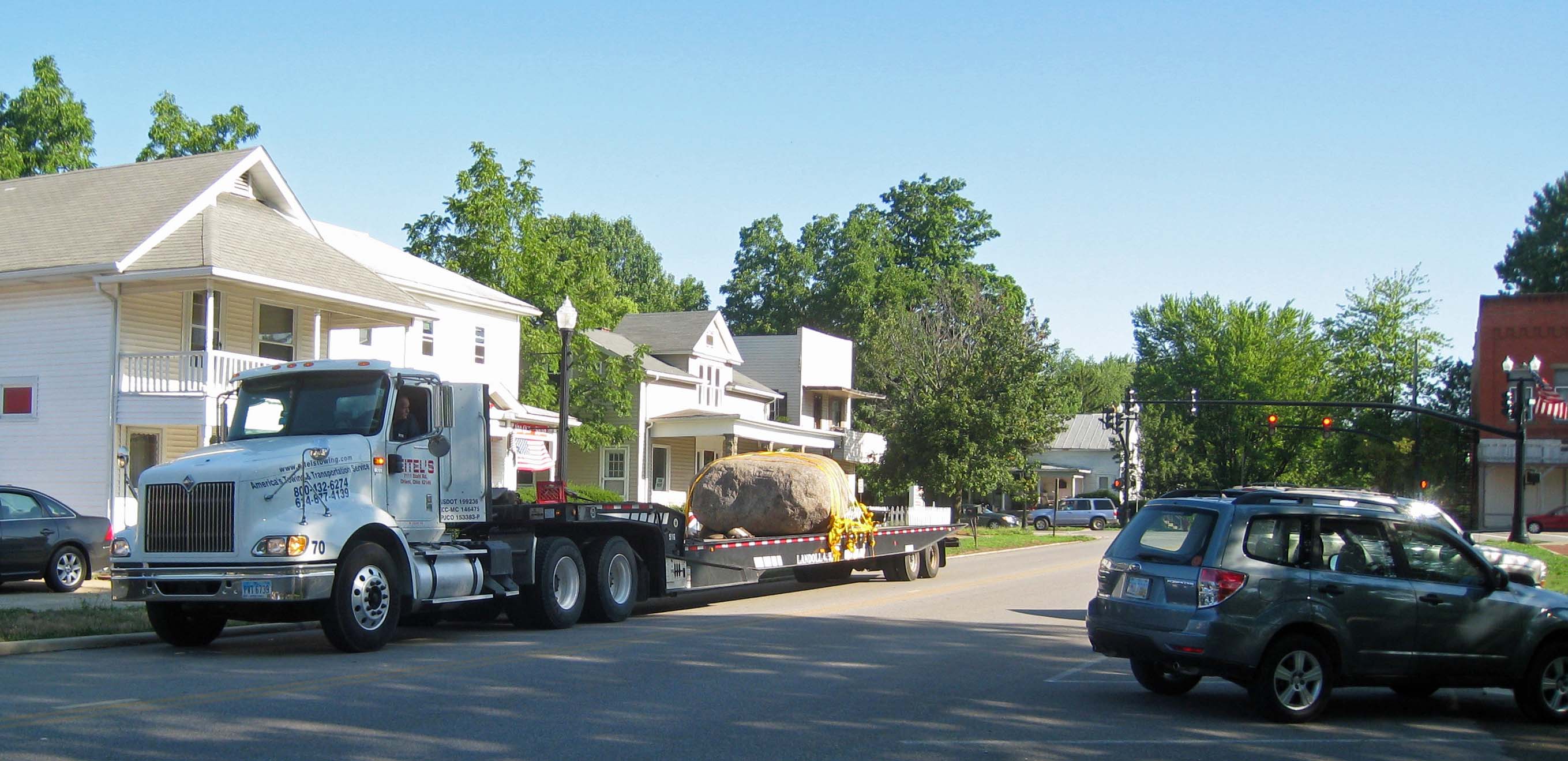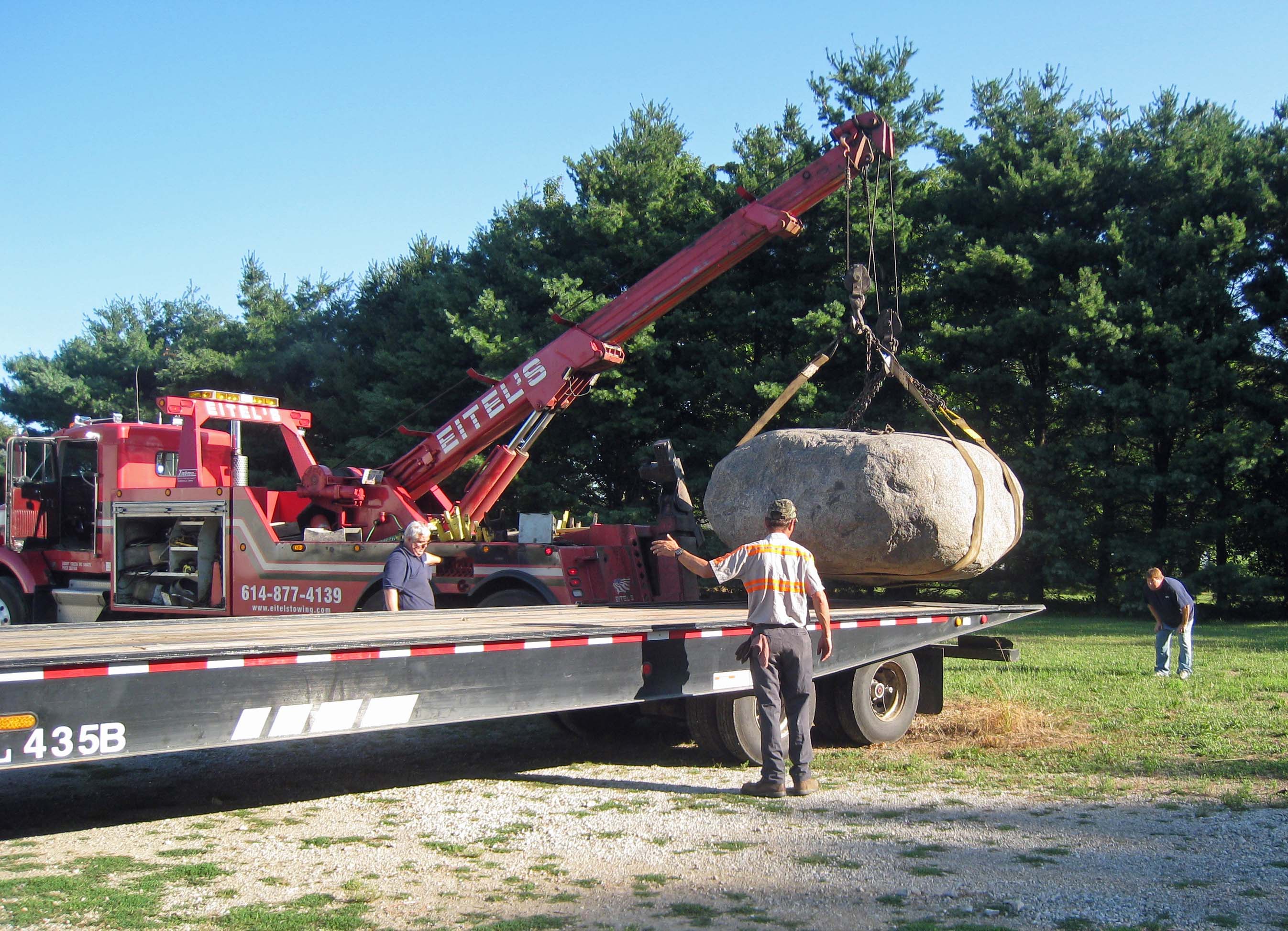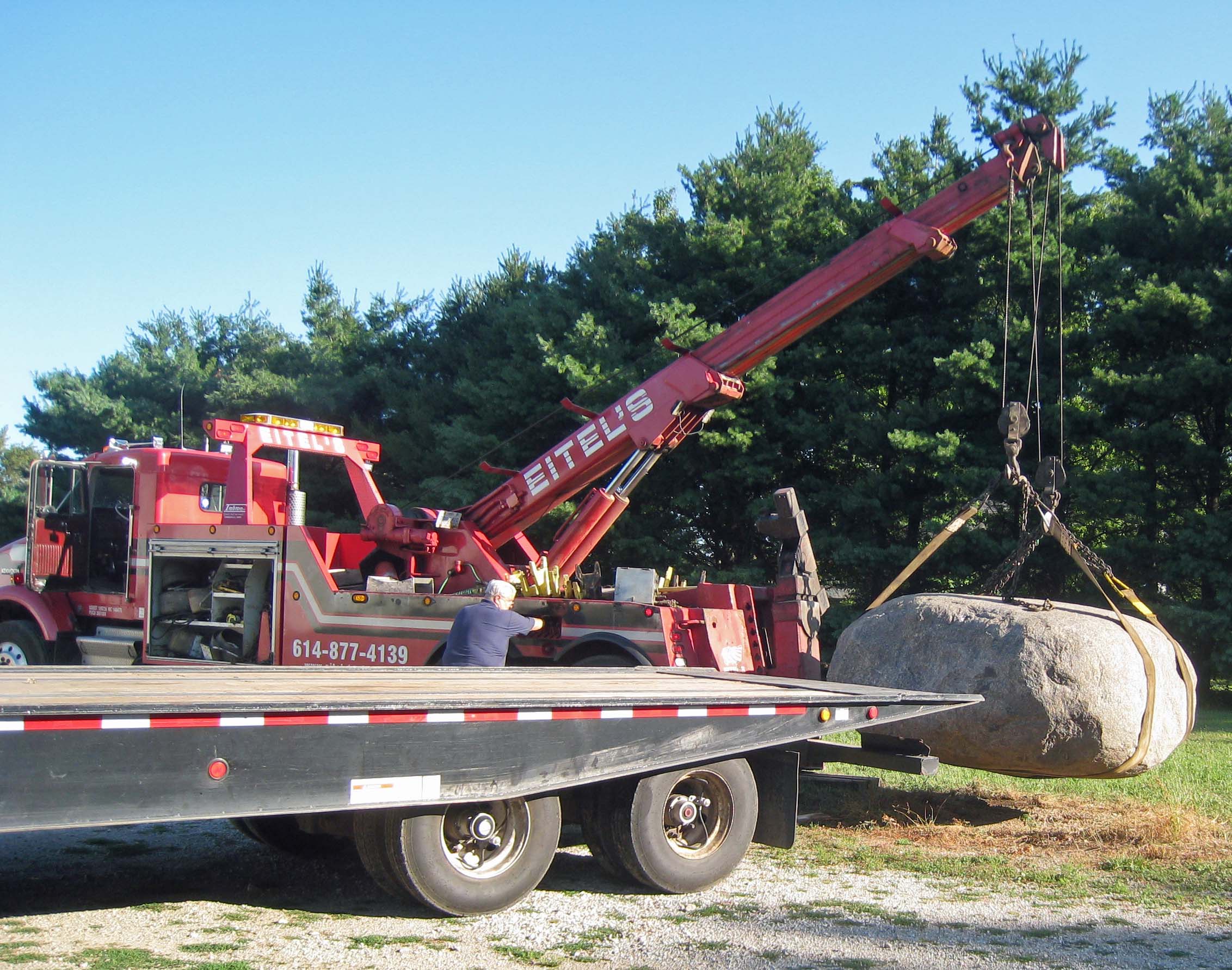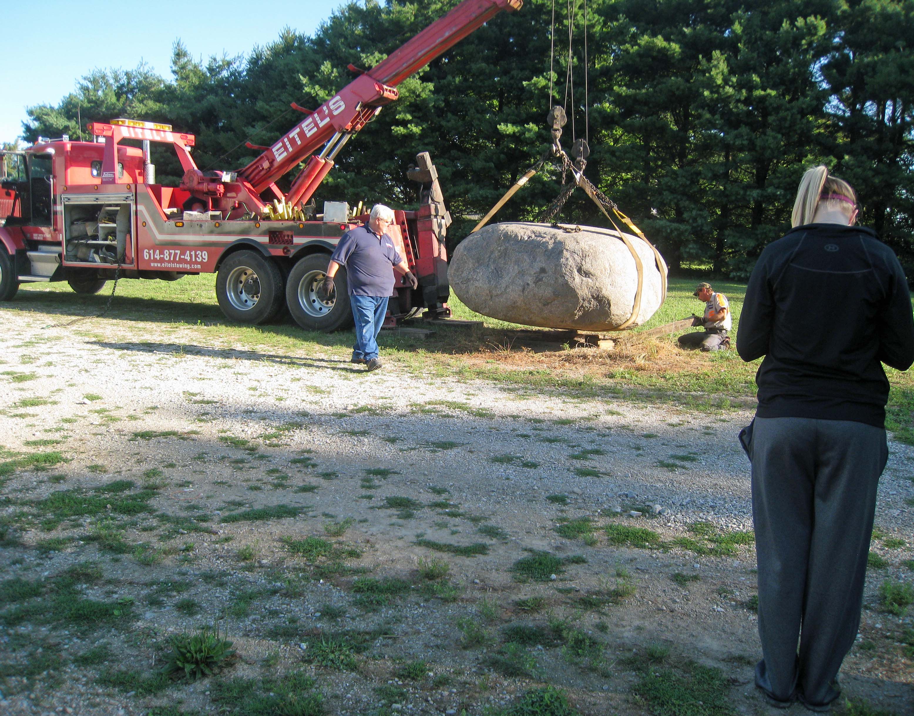 8:05 a.m. Stacy Wills and crew of Eitels Towing arrived at Tom Paul's farm to pick up the boulder stored there almost 2 years ago. |